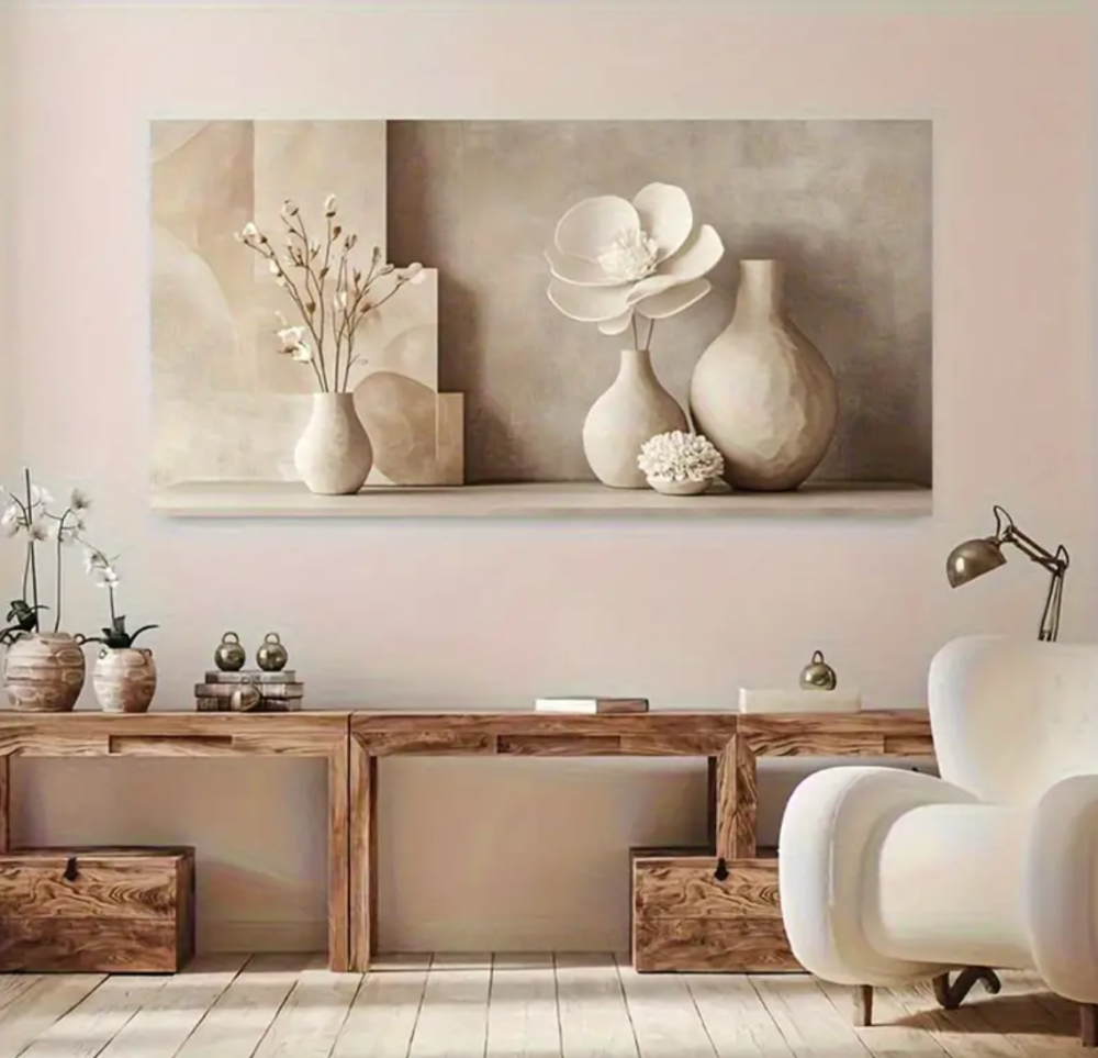 •لوحات قماشية مشدودة على إطار مخفي او مع امكانية اضافة برواز خارجي